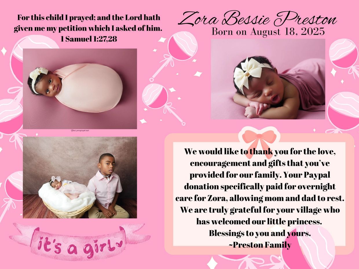 Baby Zora was born at the same hospital that the Preston's, and their organization, Carter G Cares, provide monthly support and resources for NICU families. This family, individually, and collectively, serve the community, and are themselves dedicated to making things easier for families with new babies. We are excited for you to give back to this family through donations to their postpartum care. Scroll down and hit the DONATE button.